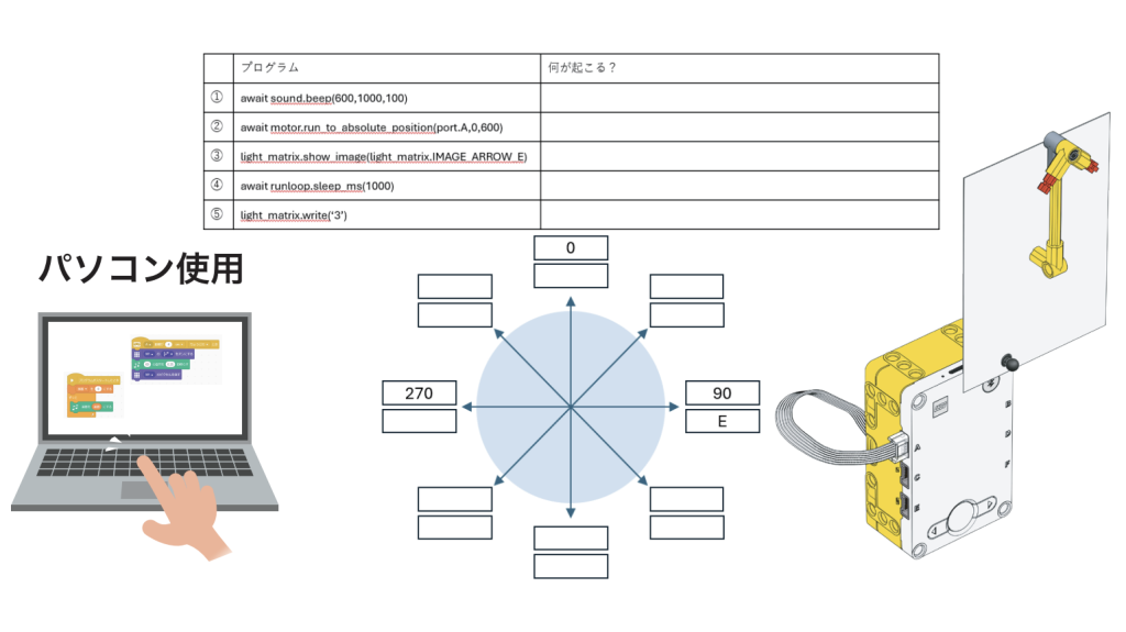 救助隊が正確に要救助者野本に向かうために、スマートナビゲーターを見ながら進みましょう。Python という実際のソフトウェアやアプリケーションに使用されているプログラミング言語で SPIKE™ プライムを動かします。