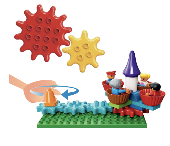 たくさんの歯車や「くるくる遊園地セット」のカラフルなパーツを組み合わせて、オリジナルのアトラクションへと発展させましょう!