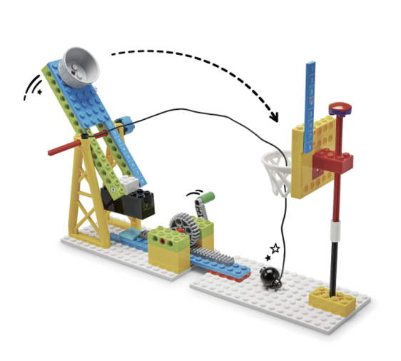 バスケットボールのフリースロー大会を開催しましょう!「BricQモーションベーシック」を用いて、てこの原理を活用した、ボールを投げる装置を作り、装置のデザインを工夫して様々な高さ・距離にあるゴールにシュートを決めましょう!