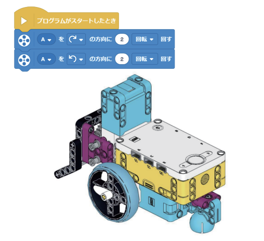 「レゴ®︎エデュケーションSPIKE™ プライム」でサッカーゲームに挑戦します。Scratchベースのテキスト型のプログラムでトライ&エラーを繰り返して、スタートラインからボールまでの最適な回転数を探します。